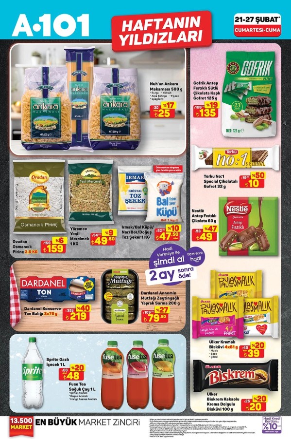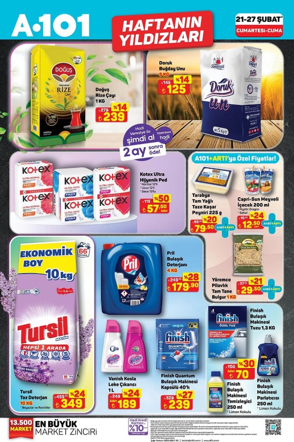 Şubat ayının bu son haftasında alışveriş listenizi hazırlarken A101’in güncel fiyatlarına mutlaka göz atın. Hem kaliteli hem de uygun fiyatlı ürünlerle evinizin tüm ihtiyaçlarını tek adresten karşılayabilirsiniz. Ayrıca 10 TL ve üzeri alışverişlerinizde geçerli olan özel fırsatlarla tasarrufunuzu katlamanız mümkün. İşte reyon reyon güncel fiyat listesi