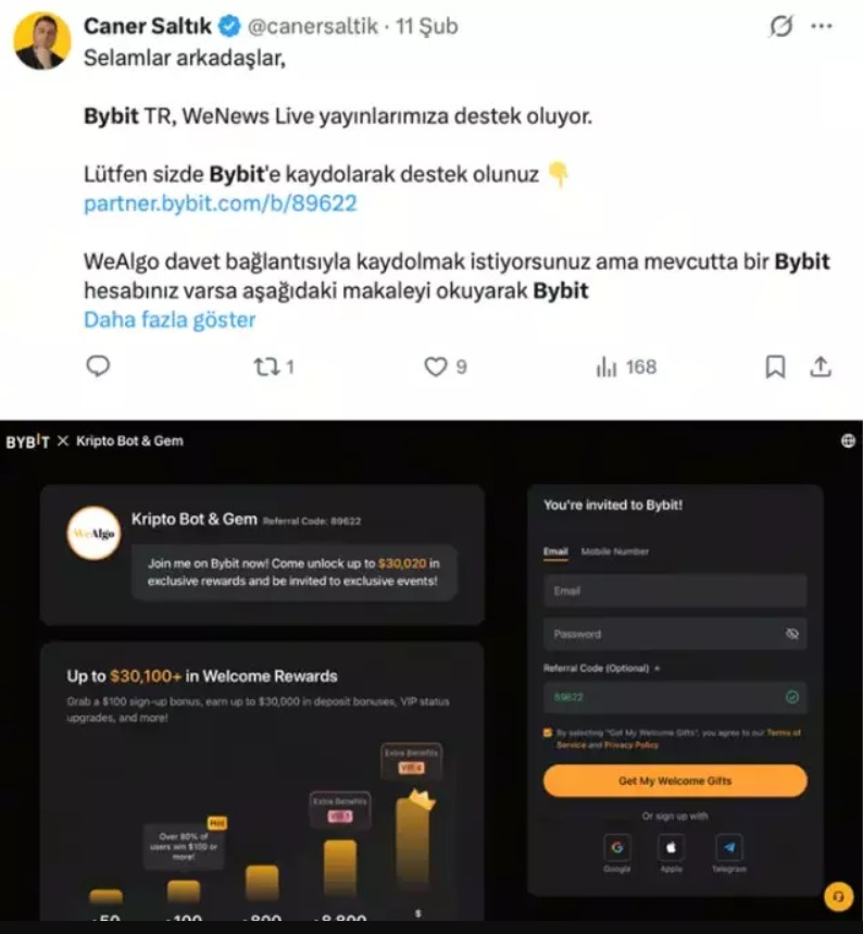 Telegram ve X (Twitter) İstilası: Yüz binlerce takipçisi olan Türk fenomenler, Bybit’e ait affiliate linklerini aktif olarak paylaşmaya devam ediyor.