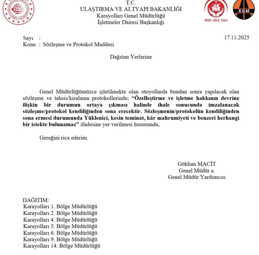 17 Kasım 2025 Tarihli Yazı: Bakanlık, bölge müdürlüklerine gönderdiği talimatta, otoyol üzerindeki kiralama ve tahsis sözleşmelerine yeni bir madde eklenmesini istiyor. Bu maddeye göre; otoyolların özelleştirilmesi durumunda mevcut sözleşmeler kendiliğinden düşecek ve işletmeciler herhangi bir tazminat talep edemeyecek.