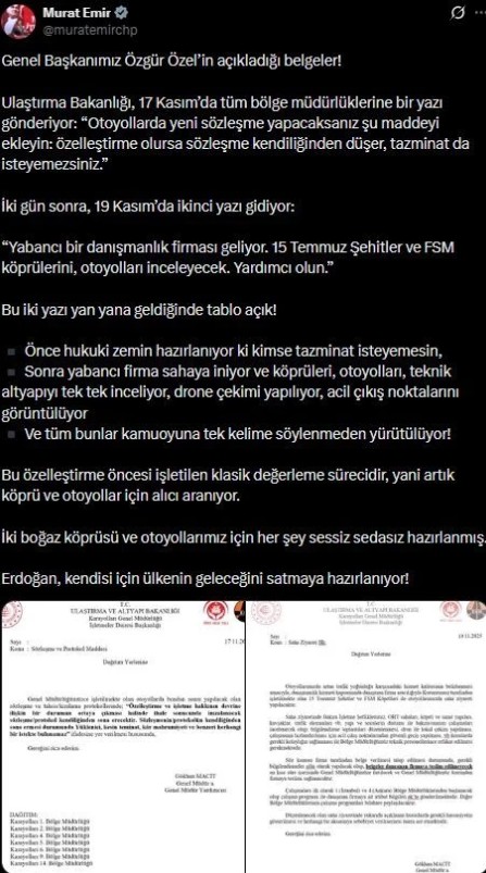 CHP Genel Başkanı Özgür Özel’in Kocaeli mitinginde gündeme getirdiği köprü ve otoyolların özelleştirilmesine ilişkin gizli yazışmalar, CHP Grup Başkanvekili Murat Emir tarafından kamuoyuyla paylaşıldı. Belgelerde, yabancı bir firmanın köprülerde inceleme yapması ve sözleşmelere “özelleştirme şerhi” konulması talimatı yer alıyor.