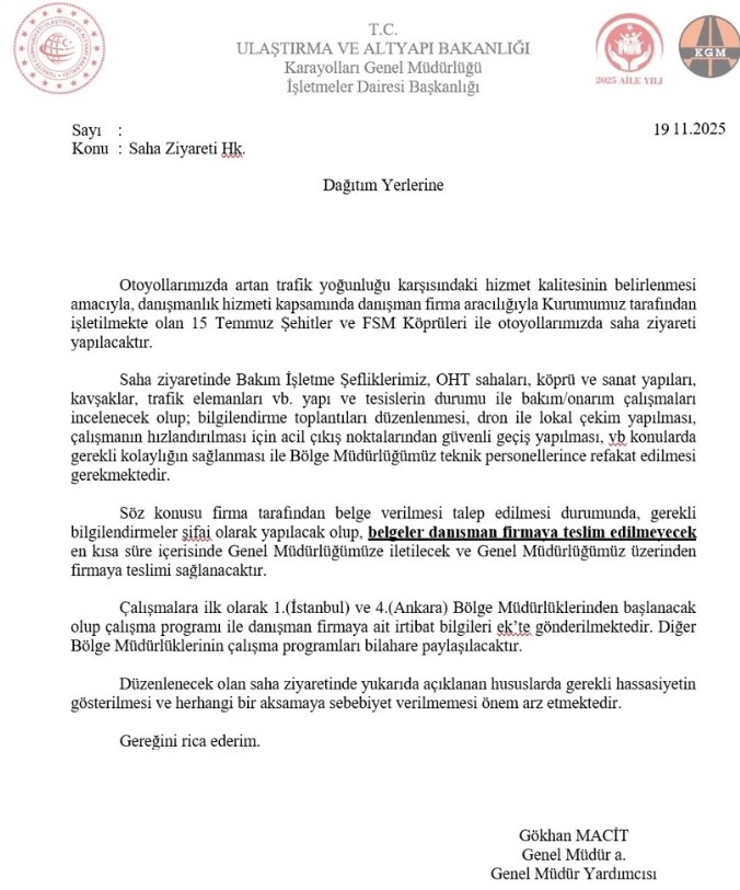 19 Kasım 2025 Tarihli Yazı: İkinci yazıda ise yabancı bir danışmanlık firmasının sahaya ineceği belirtiliyor. Firmanın, 15 Temmuz Şehitler Köprüsü ve Fatih Sultan Mehmet Köprüsü ile otoyollar üzerinde teknik inceleme, drone çekimleri ve acil çıkış noktası görüntülemeleri yapacağı ifade edilerek personele “yardımcı olunması” talimatı veriliyor.