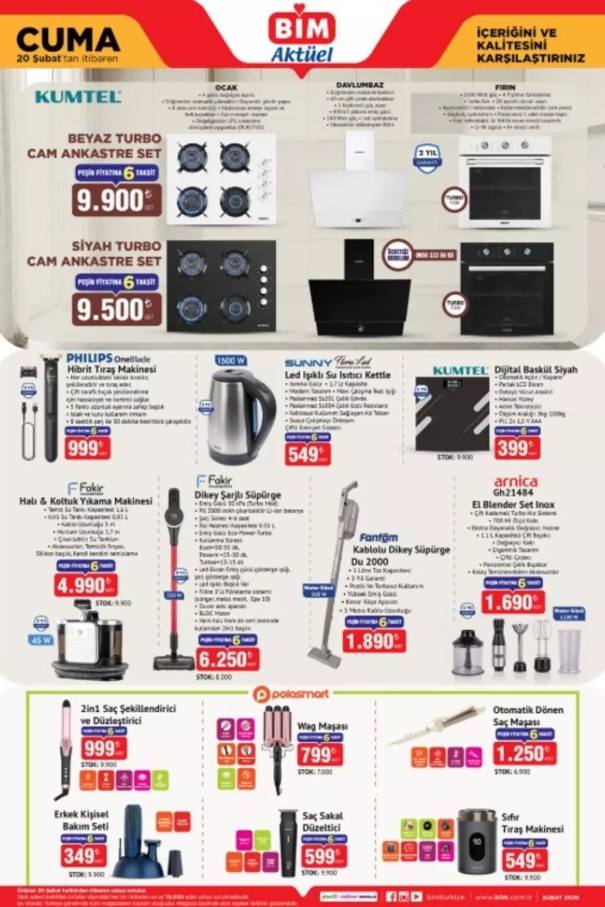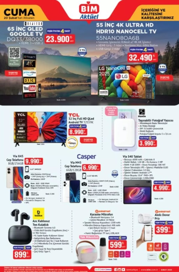 BİM 20 Şubat 2026 kataloğu yayınlandı! Bu cuma raflarda LG 55 inç Nanocell TV’den Kumtel ankastre setlere, Casper akıllı telefonlardan profesyonel saç şekillendirme ürünlerine kadar dev indirimler var. İşte o liste…